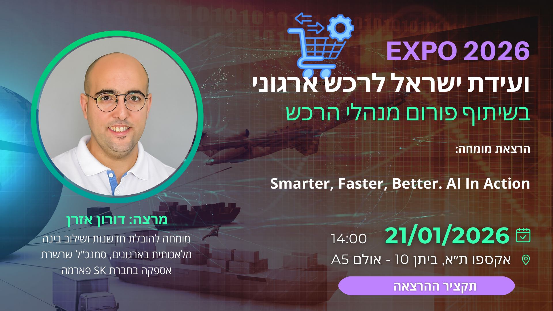 AI כבר משנה את עבודת הרכש בפועל, לא רק בשקפים. בהרצאה מקצועית ופרקטית דורון עזרן מציג איך משלבים בינה מלאכותית ו Big Data כדי לקבל החלטות חכמות יותר בתכנון רכש ובשרשרת האספקה, לצמצם סיכונים, לזהות הזדמנויות מוקדם ולהוריד עלויות וזמן בלי לפגוע ברציפות תפעולית.