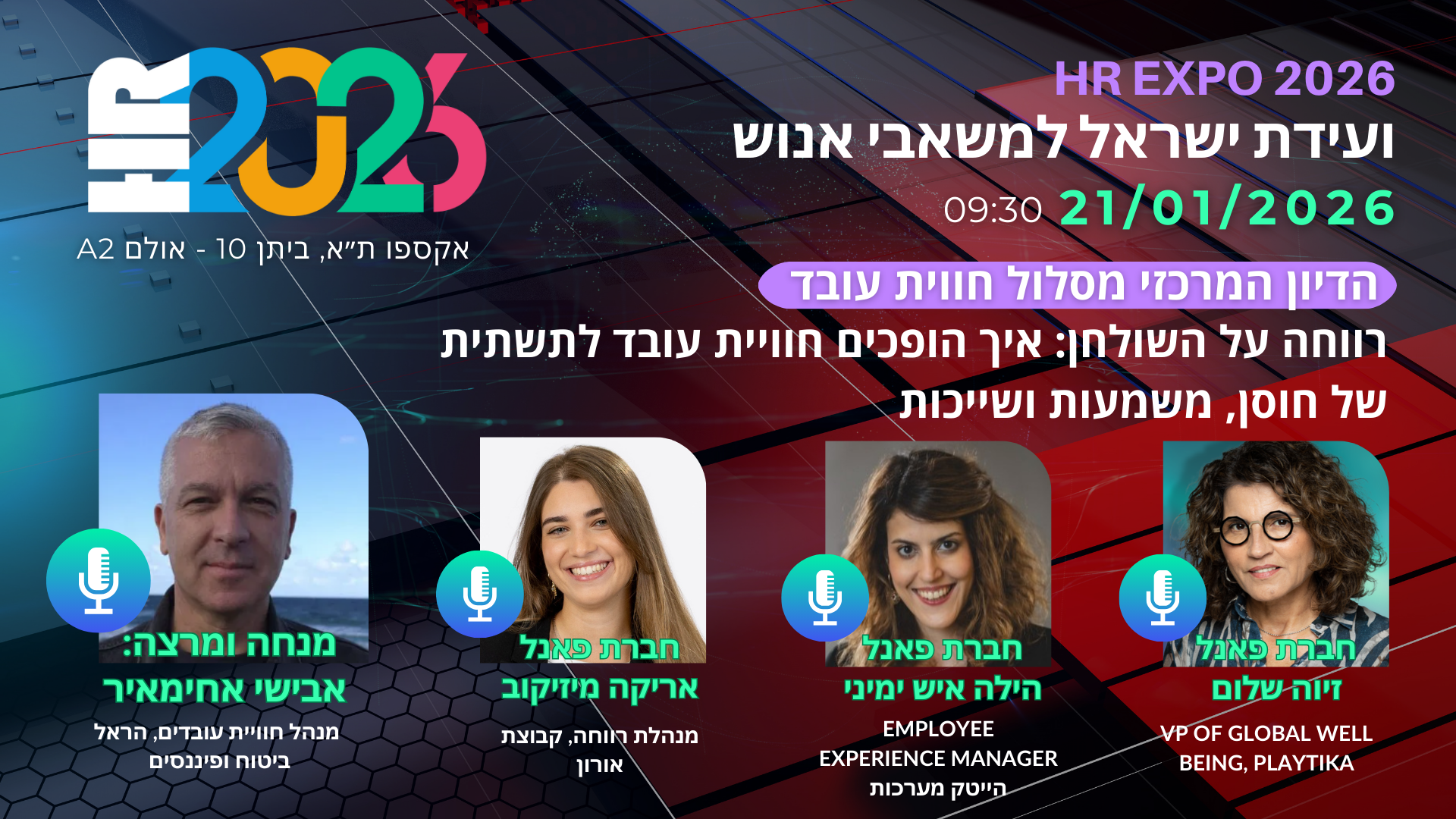 מנחה ומרצה: אבישי אחימאיר – מנהל חוויית עובדים ב"הראל ביטוח ופיננסים", חברות פאנל: זיוה שלום- "VP of Global Well Being, "Playtika, אריקה מיזיקוב- מנהלת רווחה, "קבוצות אורון", הילה איש ימיני- Employee Experience Manager, Aitech